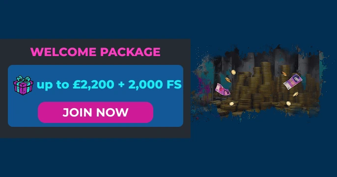 We advertise a Welcome Package up to ÂŁ2,200 + 2,000 free spins, split across multiple deposits. As described in our public company profile text, the structure includes deposit matches and large free-spin blocks across the first four deposits.